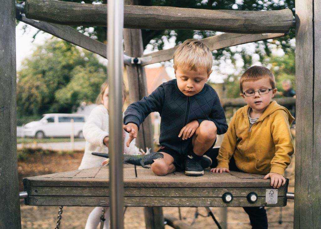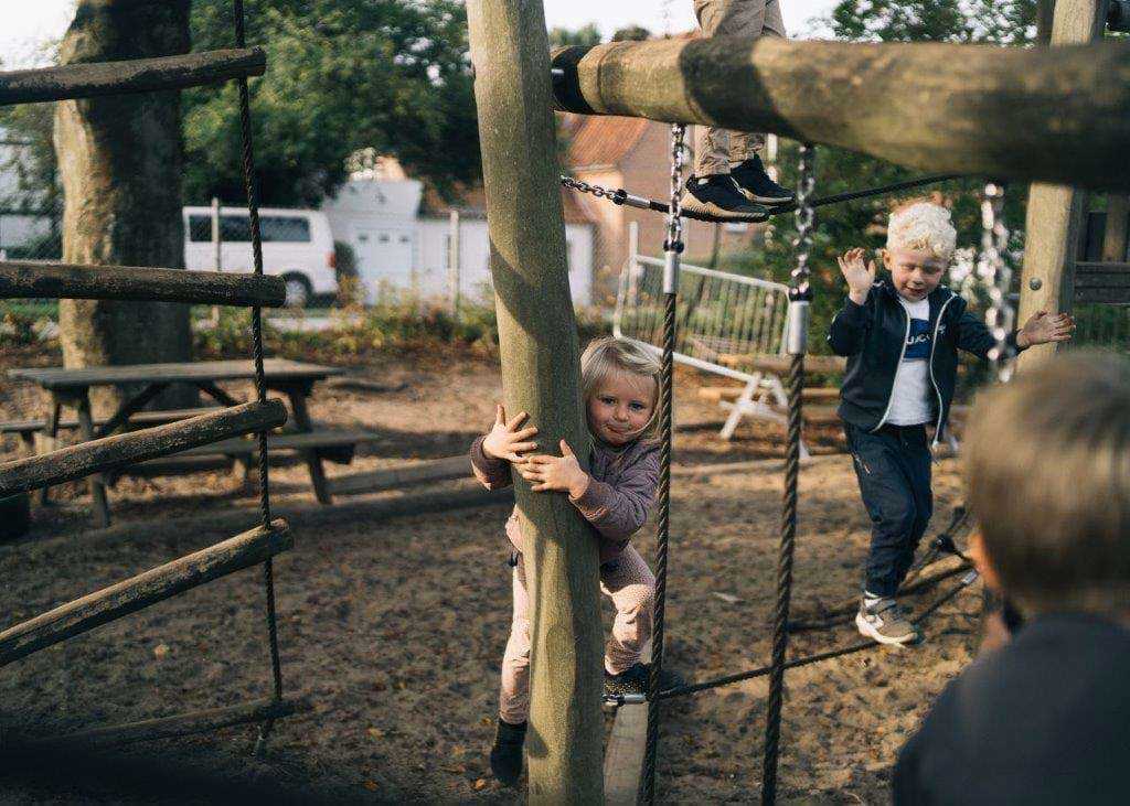 Vores legeplads er inddelt i legezoner, som ligeledes skaber plads til fordybelse med store træer til at skygge for solen i sommer halvåret.
